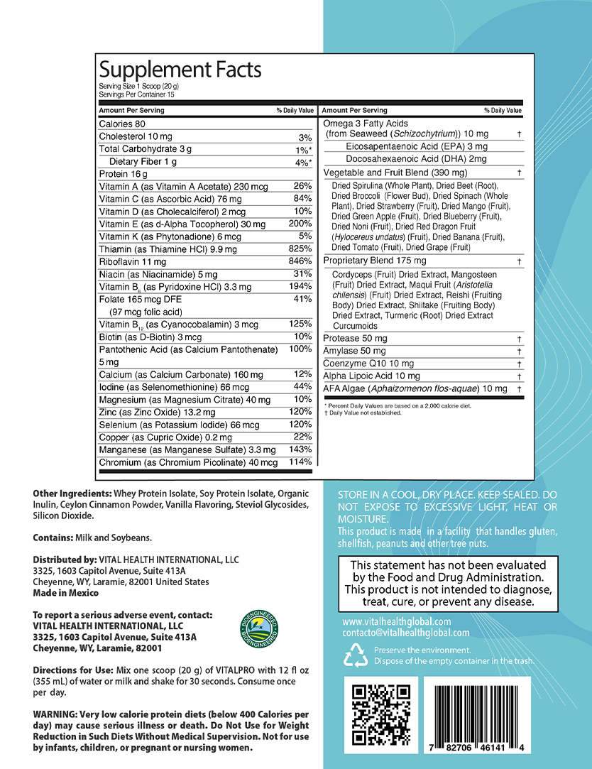 - Vitalpro combina proteínas de origen vegetal, adaptógenos, superalimentos y nutrientes funcionales para favorecer la nutrición de todo el cuerpo, la recuperación muscular y la fortaleza inmunológica.